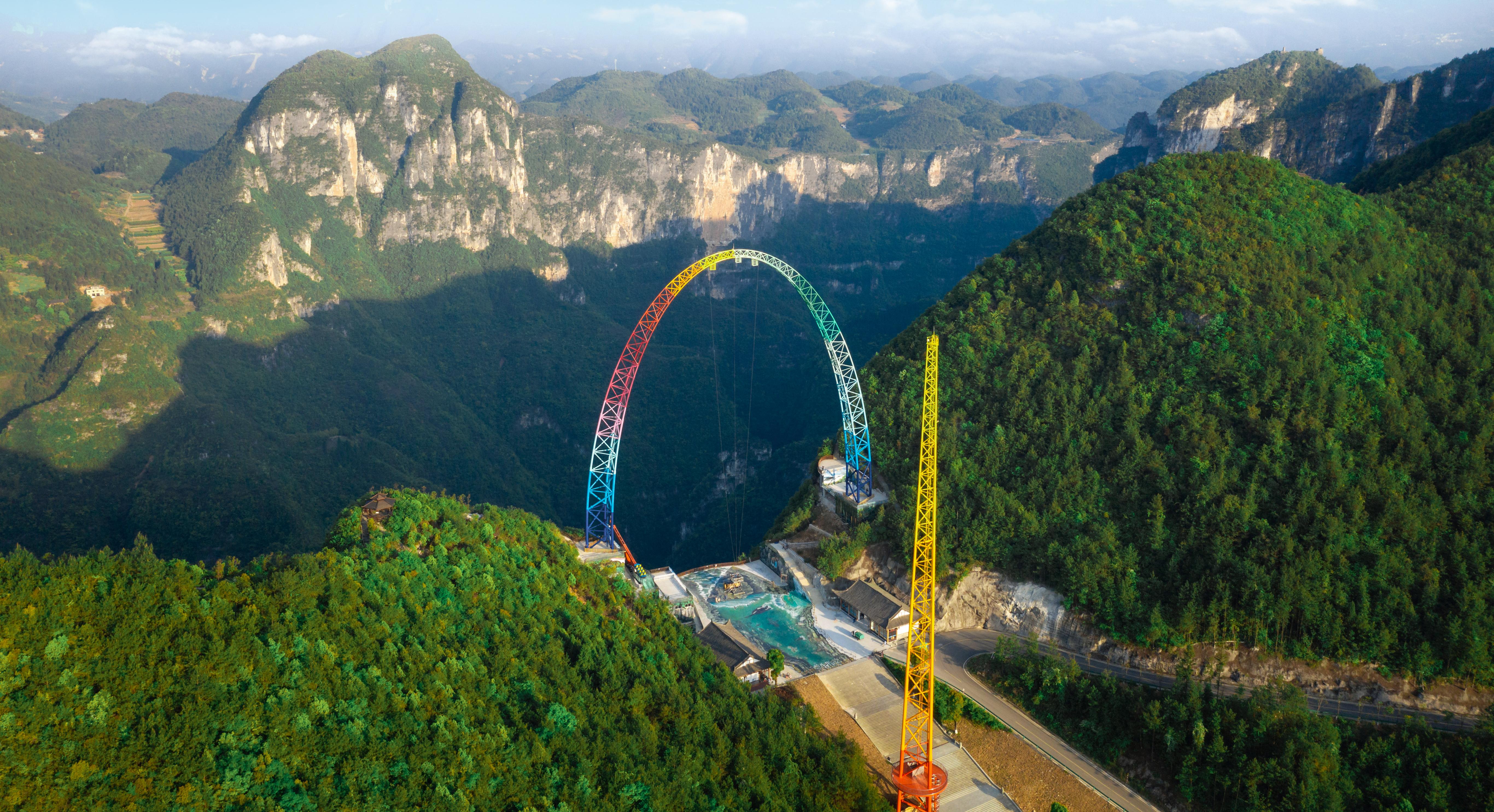 由中冶設備院自主研發(fā)、設計、制造、安裝的云端彩虹秋千,坐落于重慶龍缸5A景區700米的懸崖邊緣,主體由高100米、基礎跨距87.6米的彩虹涂裝拱形塔和高108米的提升發(fā)射塔等部分組成,該設備最大提升高度88m,最大運行速度可達130km/h,以“世界最高的框架秋千”稱號被載入吉尼斯世界紀錄。